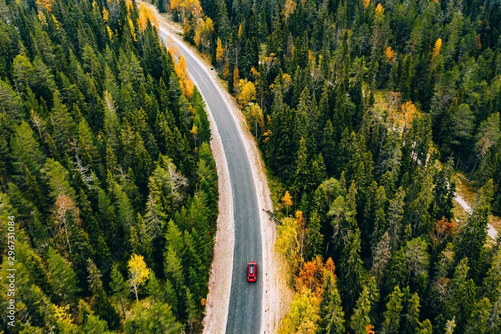 Aerial view of autumn color forest in the mountains and a road with car in Finland Lapland.