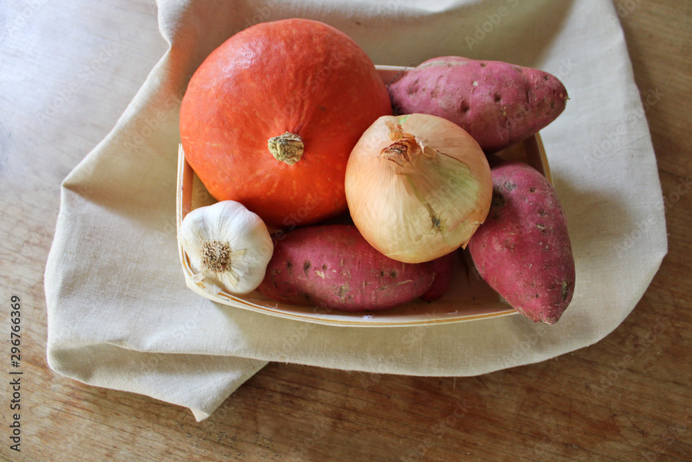 Barquette légumes entiers pour soupe : courge, patates douces, oignon, ail