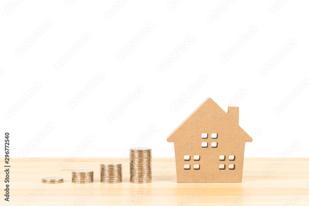 Coin stack and model house on wooden desk on white background, mortgage concept