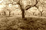 Blooming fruit trees seen in a large orchard during a mild spring. Part of this vast orchard can be seen extending to the background, the fruits being used in commercial ingredients.