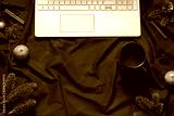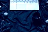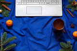 Blue Christmas New Year flat lay on the bed blanket with the laptop keyboard. Winter holiday festive card. Top view. Copy space