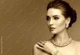 Beautiful girl with set jewelry . Woman in a necklace with a ring, earrings and a bracelet. Beauty and accessories.