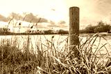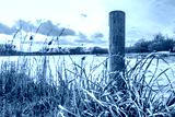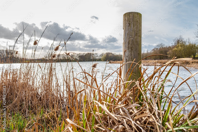 Shallow focus of a jetty wooden post seen at the waters edge of a large inland lake and nature reserve, seen in early spring.