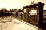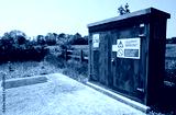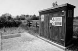 Rural electric pumping station and control cabinet seen at the edge of an english village. Showing warning signs on the green metal closet.