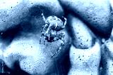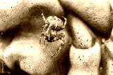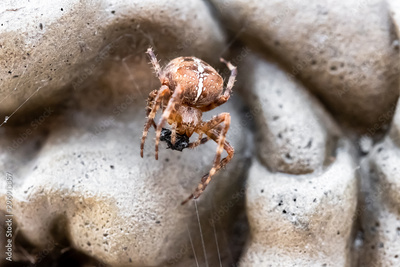 Shallow focus, macro view of a autumnal european spider seen feeding on a trapped fly. The spider has the web on a concrete garden ornament, part of which can be seen in the background.