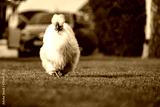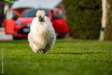 Adult Silkie chicken seen running towards the photographer in spring. The background shows a parked car in a courtyard area. Part of a private, free range flock kept for eggs.