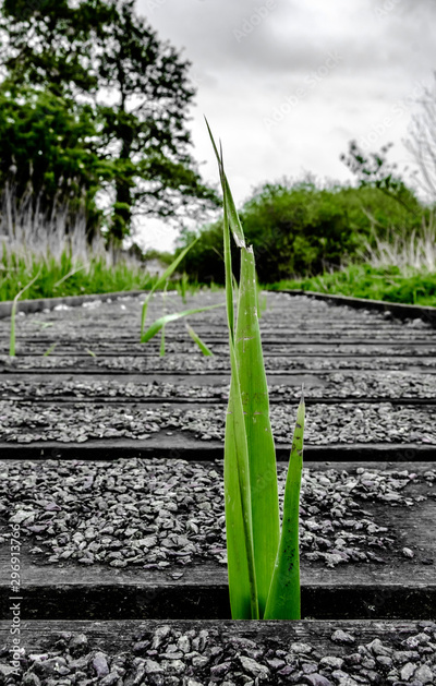 Low level view of a raised walkway showing the non-slip surface seen within a small nature reserve Island.