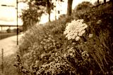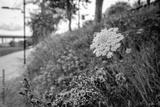 Close-up view of colourful wild flowers and long grasses seen growing on a grassy bank adjacent to a city public footpath.