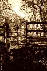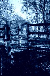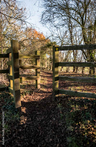 Low level view of an entrance to a forest and woodland area, showing the wooden gated entrance.