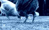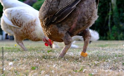 Chicken hens, of three varieties seen feeding within a summer, private garden.