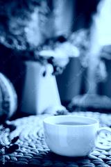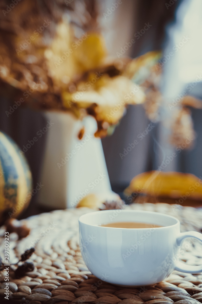 Hot steaming cup of coffee, tea with autumn bouquet, falling leaves, decorative pumpkin, cones on straw napkin. Natural decoration design. Vertical card. Close up. Soft selective focus, copy space.