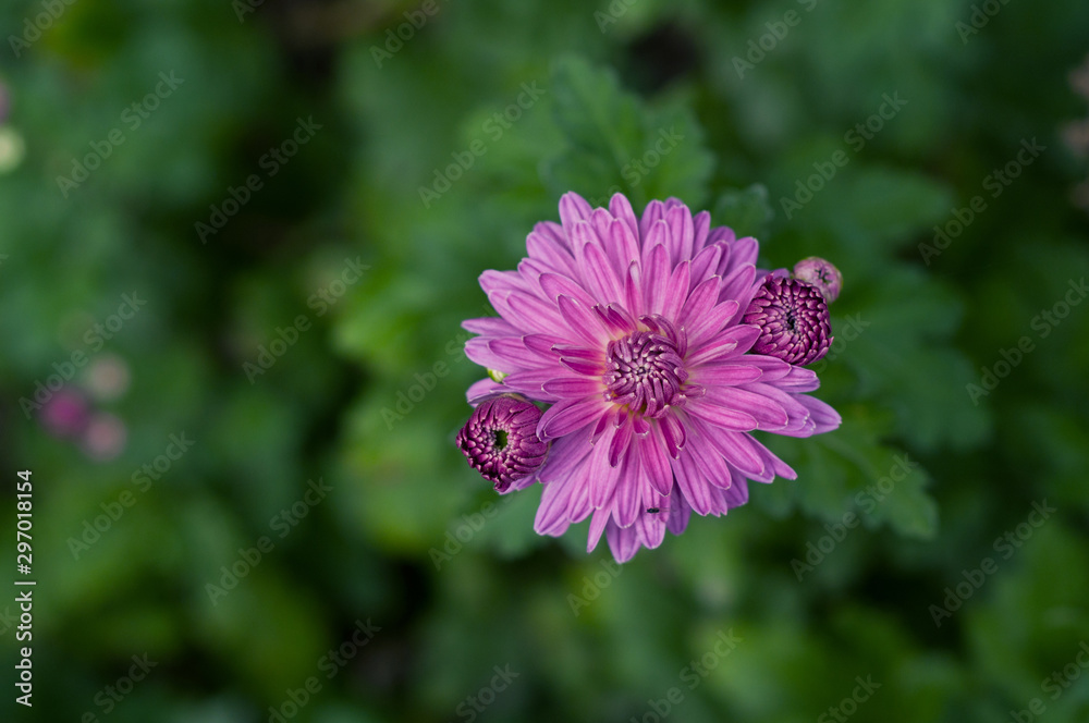 Beautiful lilac chrysanthemum in green leaves. Single flower. Garden plants. Floral background.