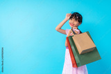 happy young Asian girl kid stylish holding shopping bag on blue background in studio, lifestyle of paid for kids fashion style concept