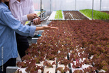 Hydroponic farm with technology, researcher, agricultural expert introduce owner farmer checking good balance of water and oxygen as temperature, lights, pH level, humidity, system of growing plant