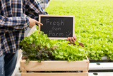 farmer holding small blackboard with word of fresh from farm in hydroponic farming