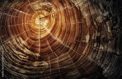 Stump of tree felled - section of the oak trunk with annual rings. Slice wood.