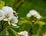 Apple blossom seen in early spring at an orchard in a commercial cider farm. Showing a honey bee locking to take nectar.