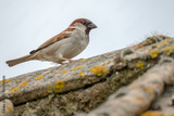 Detailed view of an adult male Sparrow seen atop a house tiled roof, seen with small grubs in his beak. His nest is under one of the roof tiles, and is part of a larger Sparrow colony.