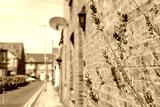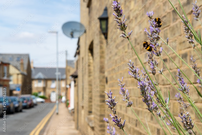 Shallow focus of summer bumble bees seen gathering nectar from wild flowers seen at the front of brick built terraced houses on an empty street.