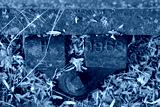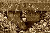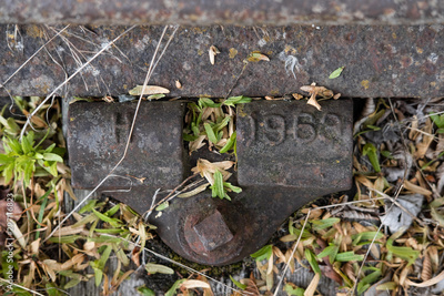 Close-up view of an abanonded railway sleeper and metal clamp system. Showing the 1960s manufacturing date, the railway tracks are now disused.
