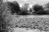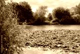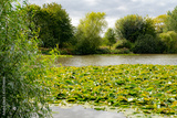 Large area of water lilly seen covering a large village lake during late summer. The lake is used for carp fishing and is seen surrounded by large trees.