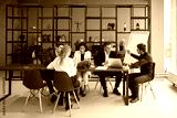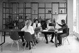 young people sitting at the desk,creating new trendy goods, full length photo. modern interior