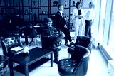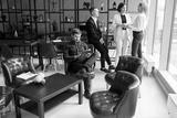 successful young businessman consulting clients online, while his partners brainstorming in the background of the photo. free time, spare time