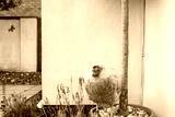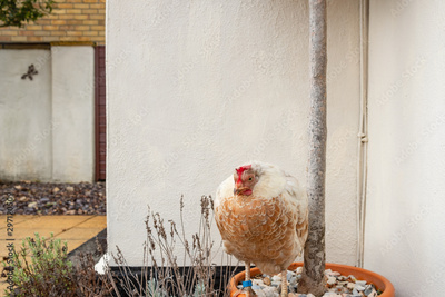 Elderly Hen seen perched on a tree tub, located by the rear door of a house. Over 8 years old, she often sleeps during midday.