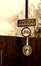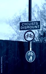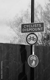 Warning sign for cyclists to dismount from there pedal bicycle as pedestrians are in the location.