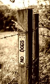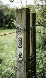 Makeshift no dogs warning sign seen attached to the edge of a farmers field in which sheep graze during summer.