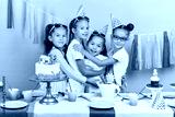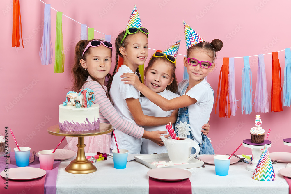 little awesome girls congratulating their best friend with birthday, isolated pink background, studio shot