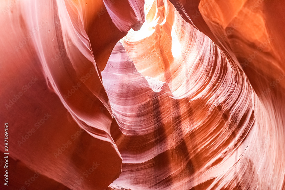 Looking up low angle at Antelope slot canyon with wave shape abstract formations of red orange rock layers sandstone in Page, Arizona