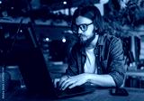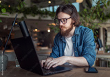 Thoughtful bearded youngster in glasses using laptop in cafe