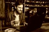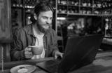 Young bearded freelancer checking email via laptop while having morning coffee in a loft bar