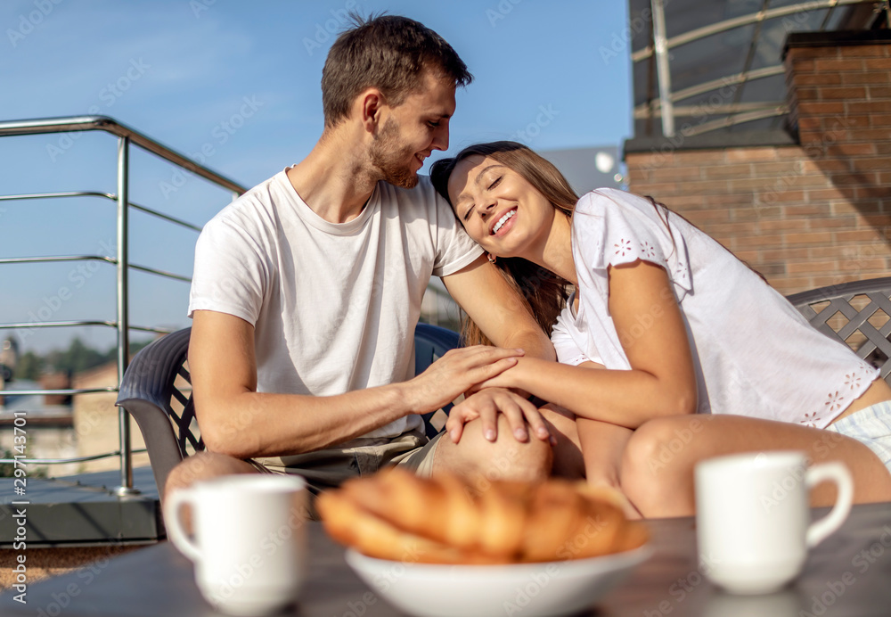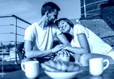 Young loving couple on balcony enjoy each others company during an outdoor breakfast on a balcony
