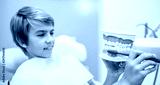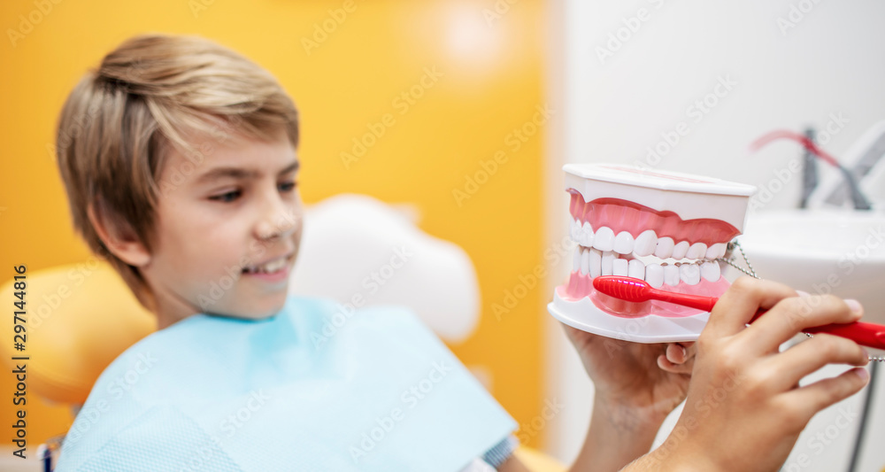 Teenage boy showing the dentist the way he usually brushes his teeth