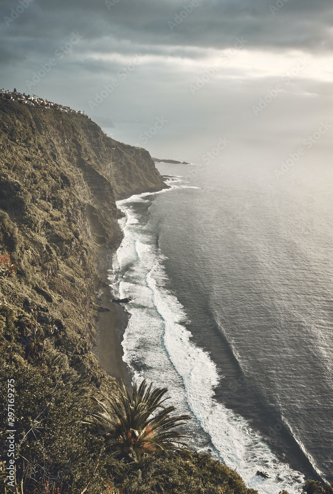 Volcanic beach seen from a cliff at sunset, color toning applied, Tenerife, Spain.