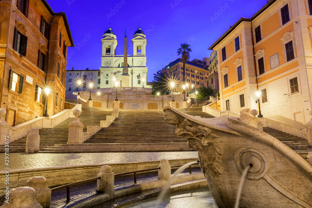 Spanish Steps, Piazza di Spagna, Fountain della Barcaccia and Trinita dei Monti church during morning sunrise in Rome, Italy.