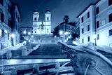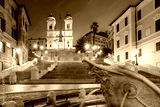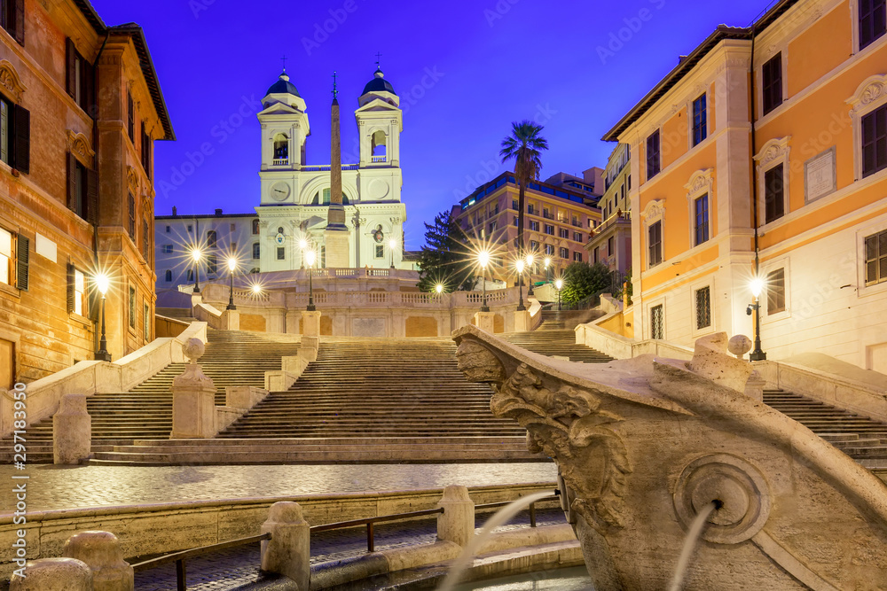 Spanish Steps, Piazza di Spagna, Fountain della Barcaccia and Trinita dei Monti church during morning sunrise in Rome, Italy.