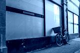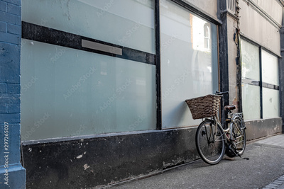 Women's old style bicycle seen lent up against the side of a shop window. The bike is down a deserted alleyway which has recently rained