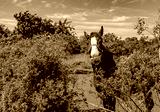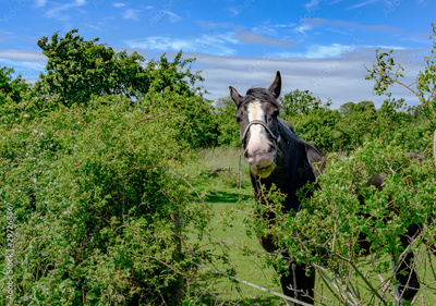 Large shire horse seen eating some of the hedgerow in which the horse is paddocked in this rural English location, seen in summer.