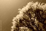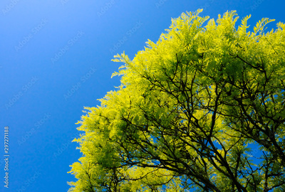 Tree canopy seen with fresh leaves and foliage against a clear blue sky.