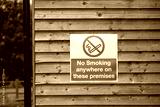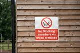 Newly attached No Smoking Sign seen nailed to a wooden building at a livery and horse yard. The sign warns visitors that No Smoking is forbidden within the stable block