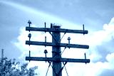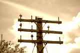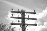 Isolated image of a very old and abandoned rail side power cable wooden pole. Showing eroded electrical insulators, the gantry have long been used.