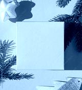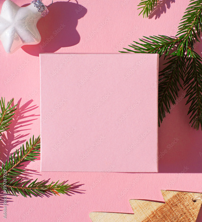 Christmas or New Year greeting card frame on the pink background with festive decoration. Copy space
