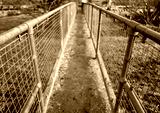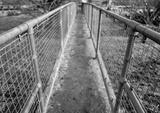 Low level view of a narrow and empty footbridge that crosses a number of rivers, seen just before dusk in a inland location in the U
