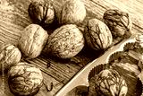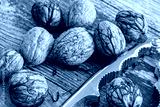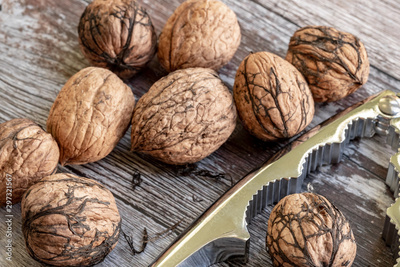 Close-up, shallow focus image of freshly cracked Walnuts seen with a metal Nutcracker. Fragments of the shells are seen on the wooden table.