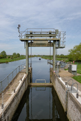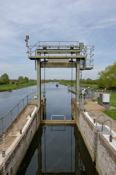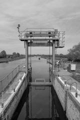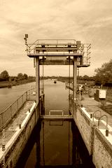 Detailed view of a Canal and River lock system, used by canal and long boats. The image shows a distant canal boat approaching the lock.
