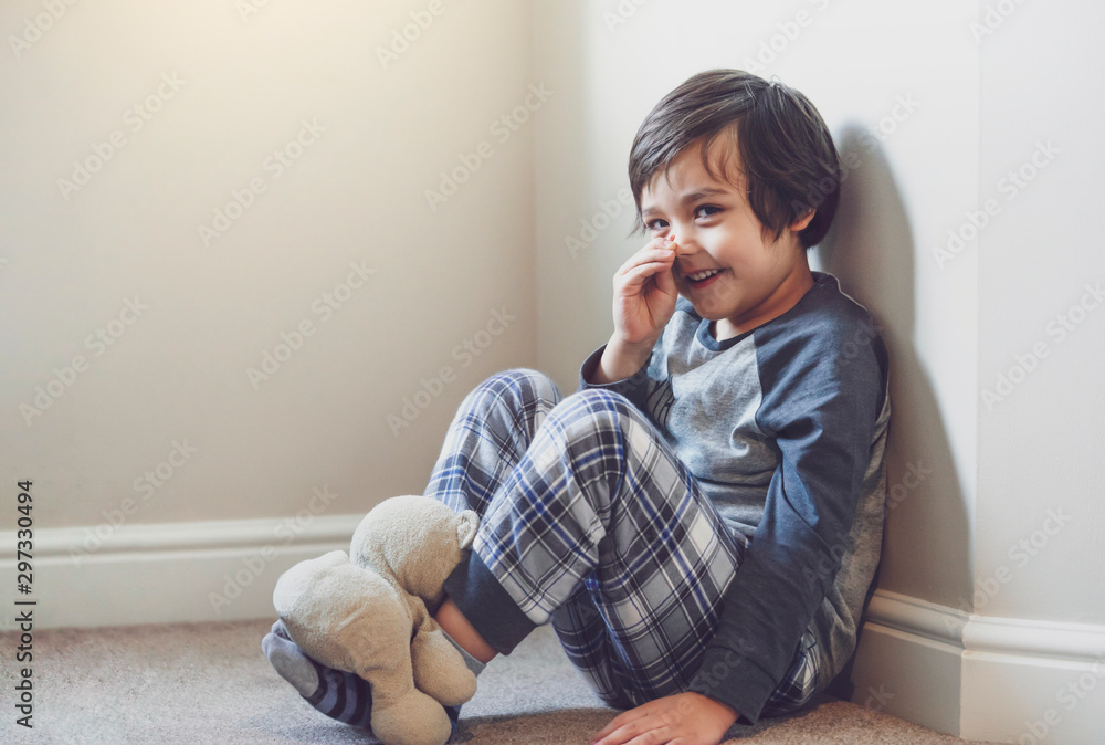 Portrait of kid picking his nose while looking at camera, Positive child smiling and making funny face, Cute little boy relaxing sitting in carpet floor at home, Cozy house with warm tone concept