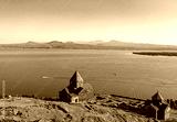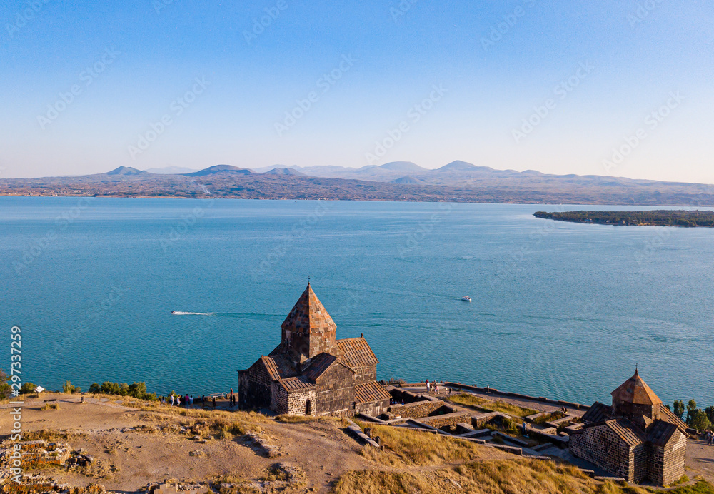Sevanavank monastery and Sevan lake from aerial view. Old Armenian architecture. Ancient church. Caucasus mountains, Armenia